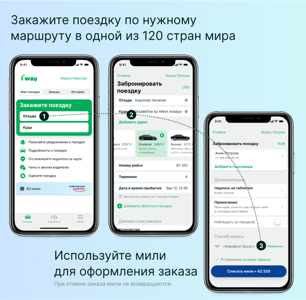 Запустили списание миль «Аэрофлот Бонус» в приложении i’way. С декабря 2020 года пассажиры i’way могут копить бонусы “Аэрофлота” за совершенные поездки. Для накопления достаточно указать в приложении i’way свой номер участника в программе “Аэрофлот Бонус”. Летом 2021 года стало возможным не только копить, но и тратить мили “Аэрофлота”, заказывая трансферы i’way.
