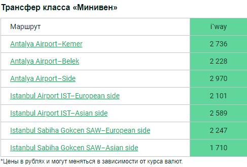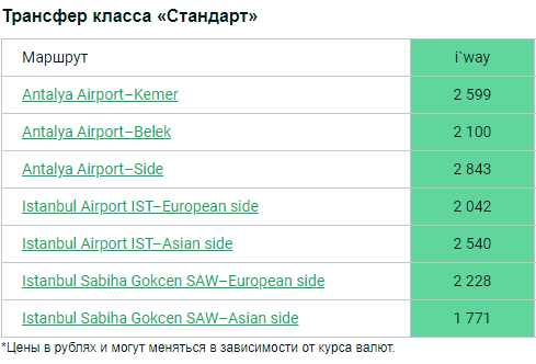 Цены на трансферы по популярным турецким направлениям: